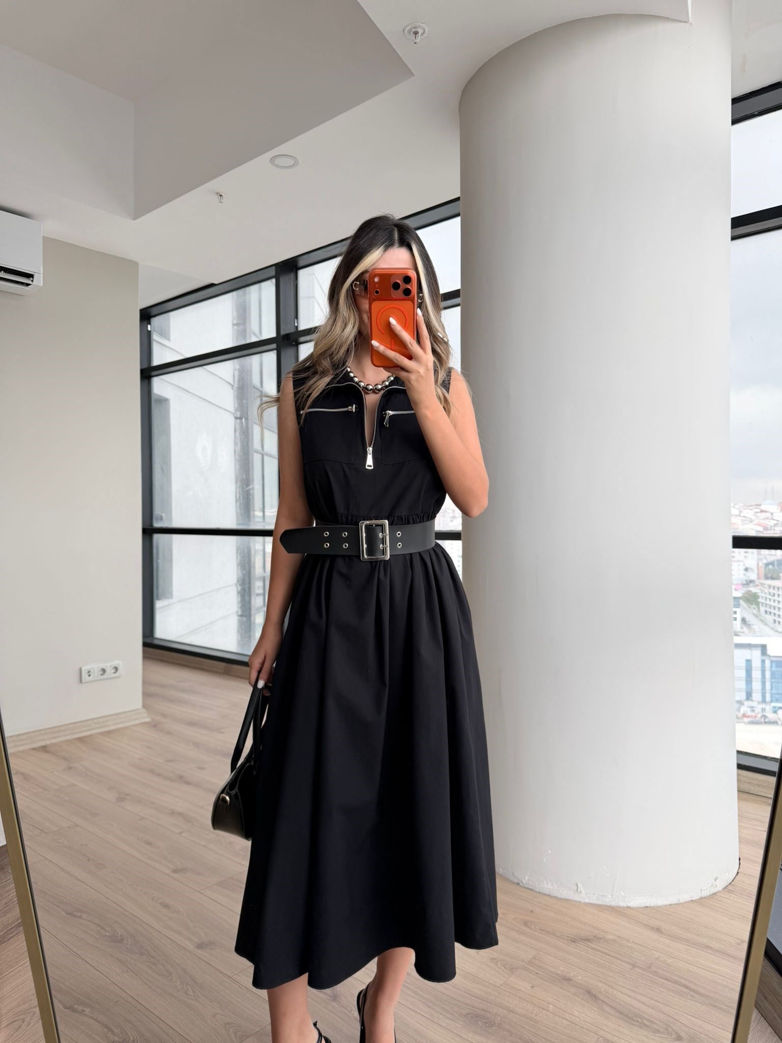 Siyah Poplin Kemerli Kolsuz Elbise