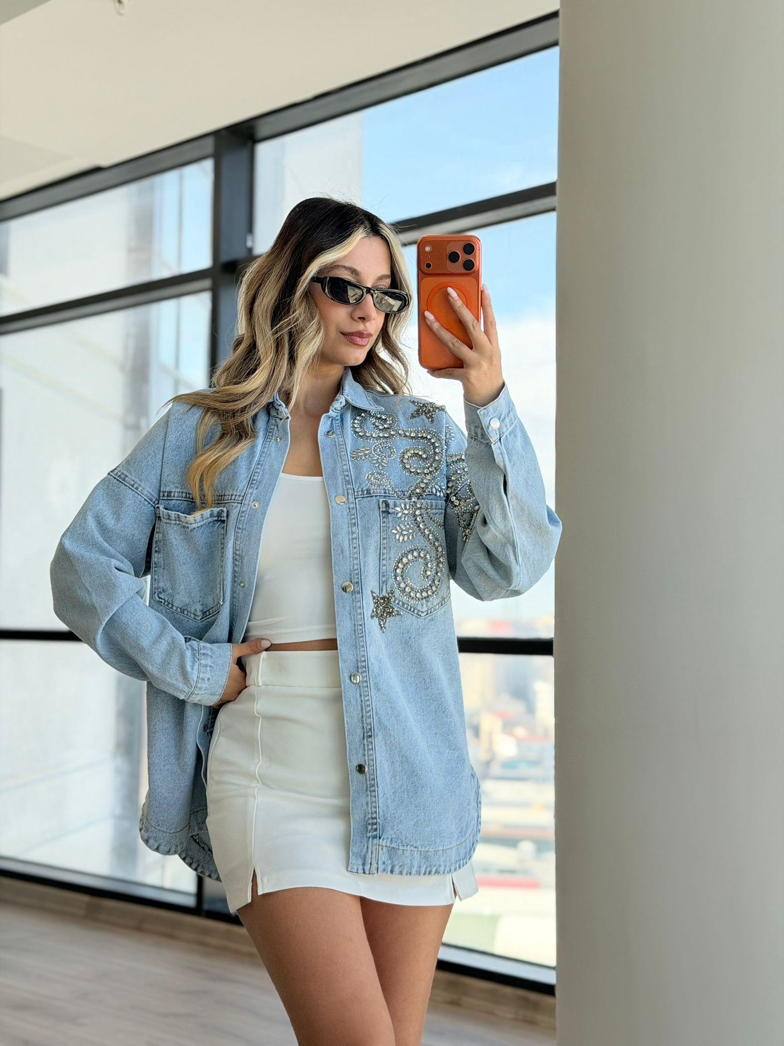 Taş işlemeli detaylarıyla öne çıkan, rahat kesim oversize denim ceket.