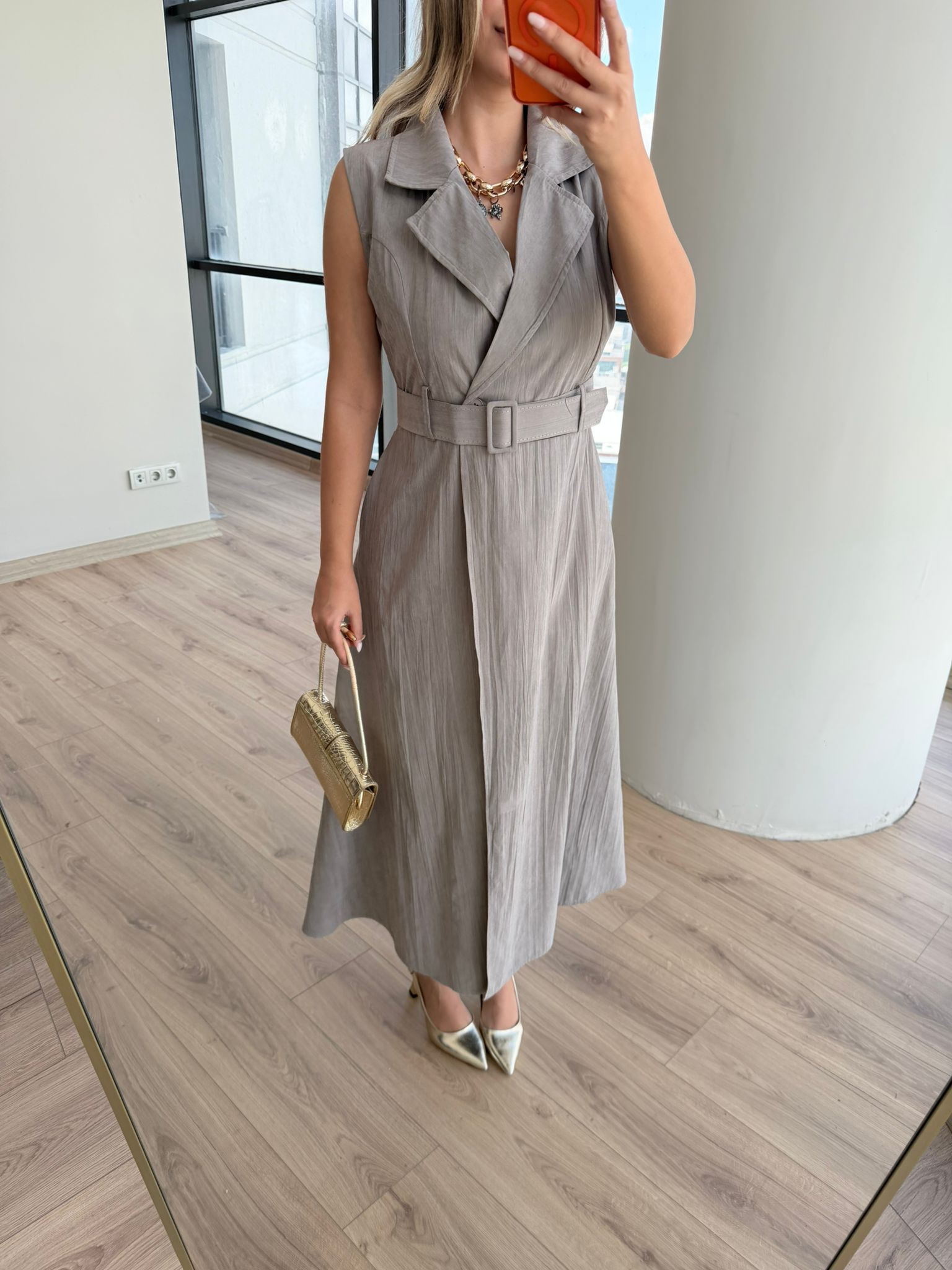Trikoton Kemerli Kolsuz Bej Elbise (yelb4266dk)