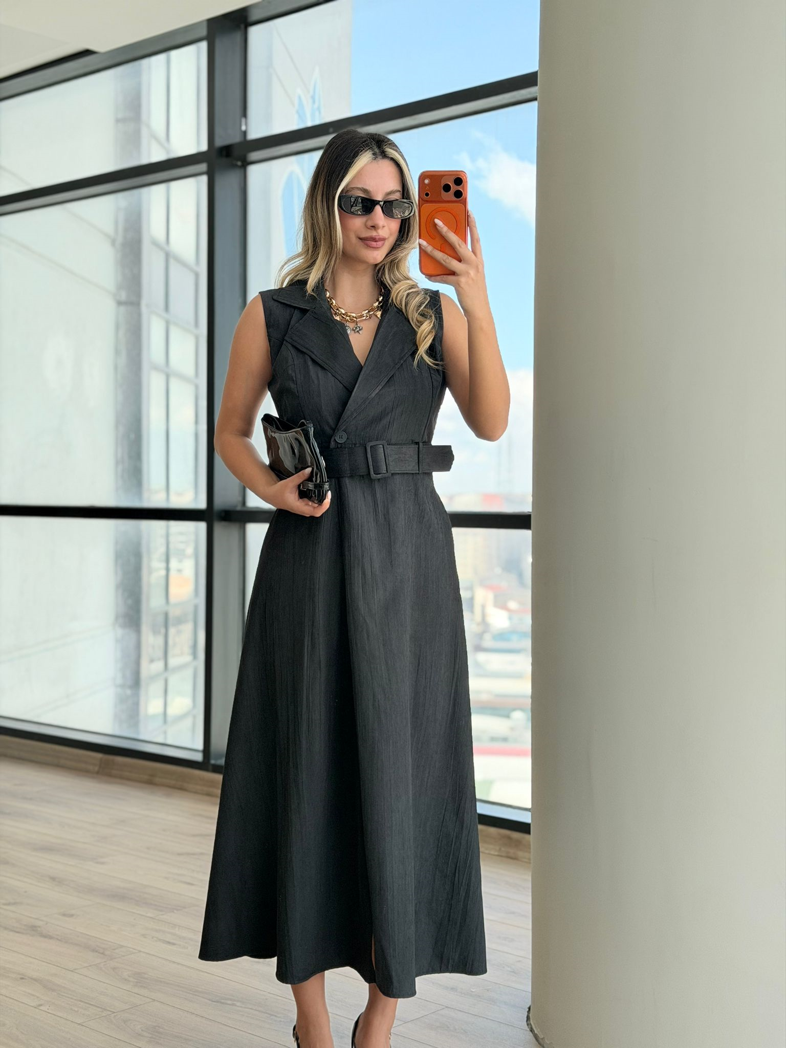 Trikoton Kemerli Kolsuz Siyah Elbise (yelb4266dk)