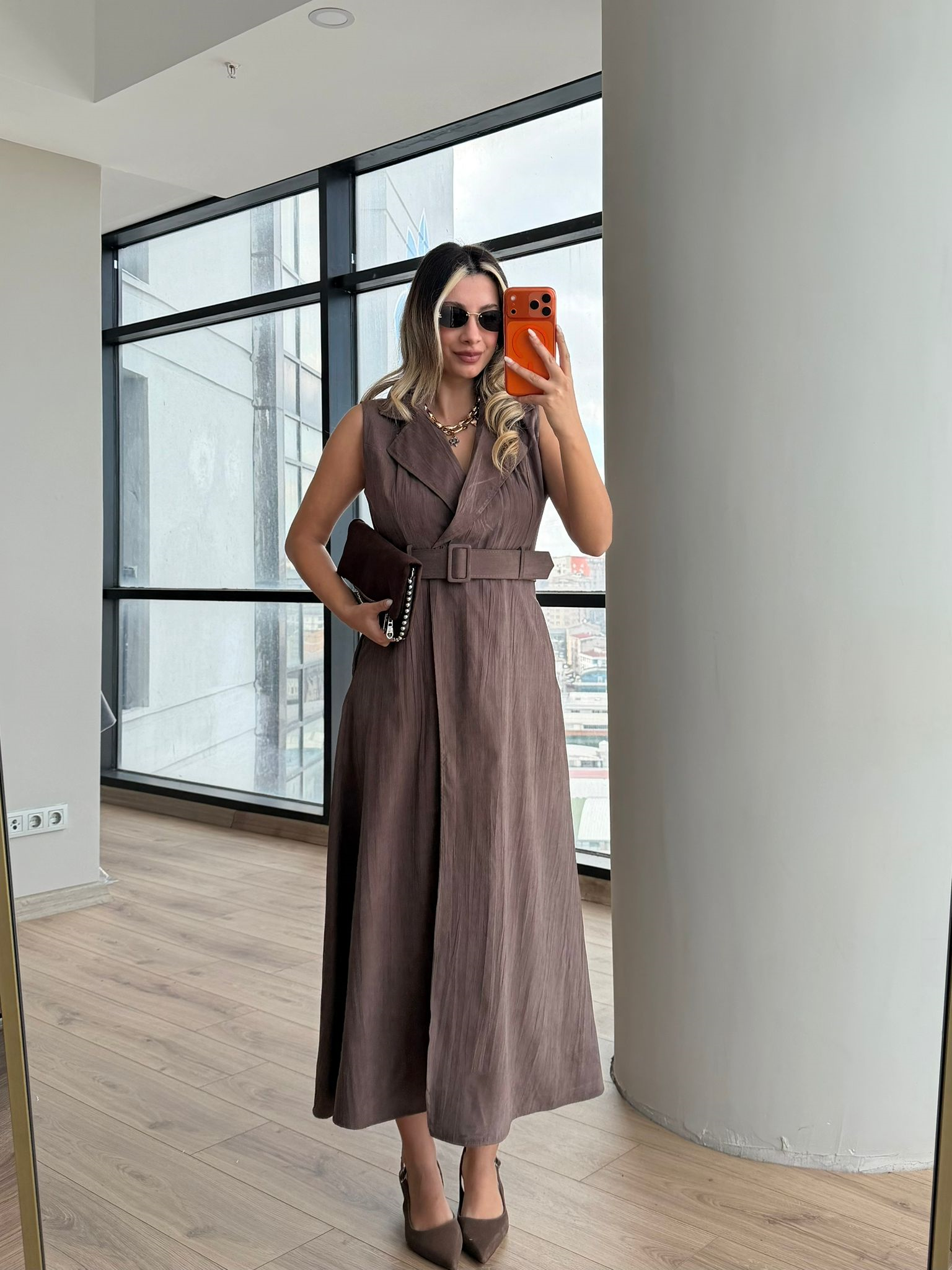 Trikoton Kemerli Kolsuz Vizon Elbise (yelb4266dk)