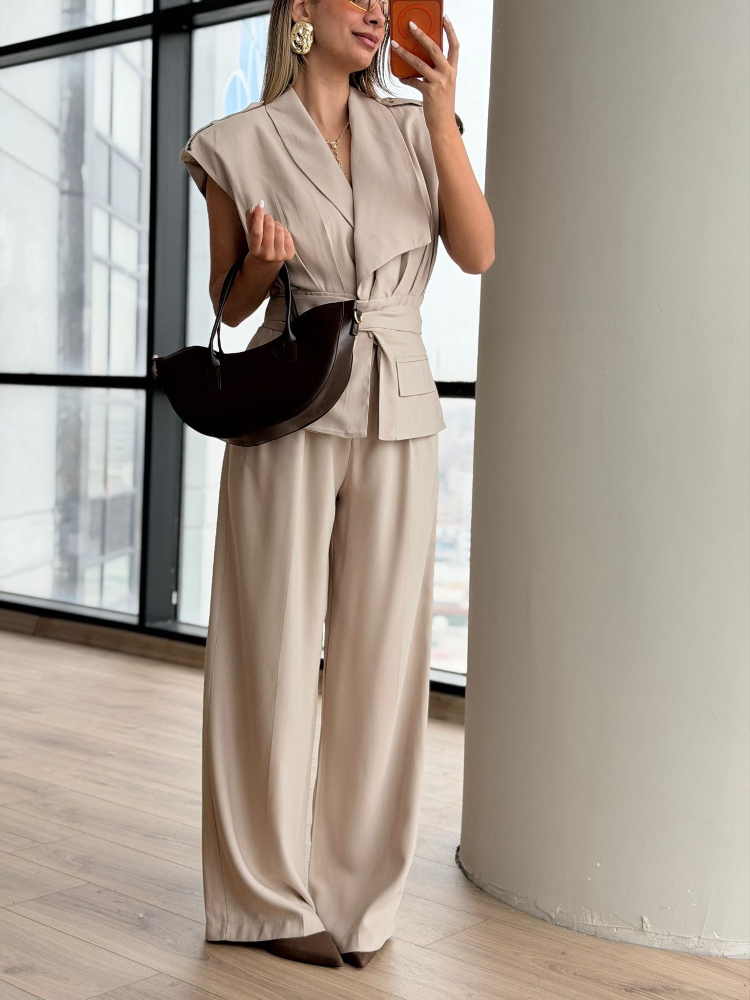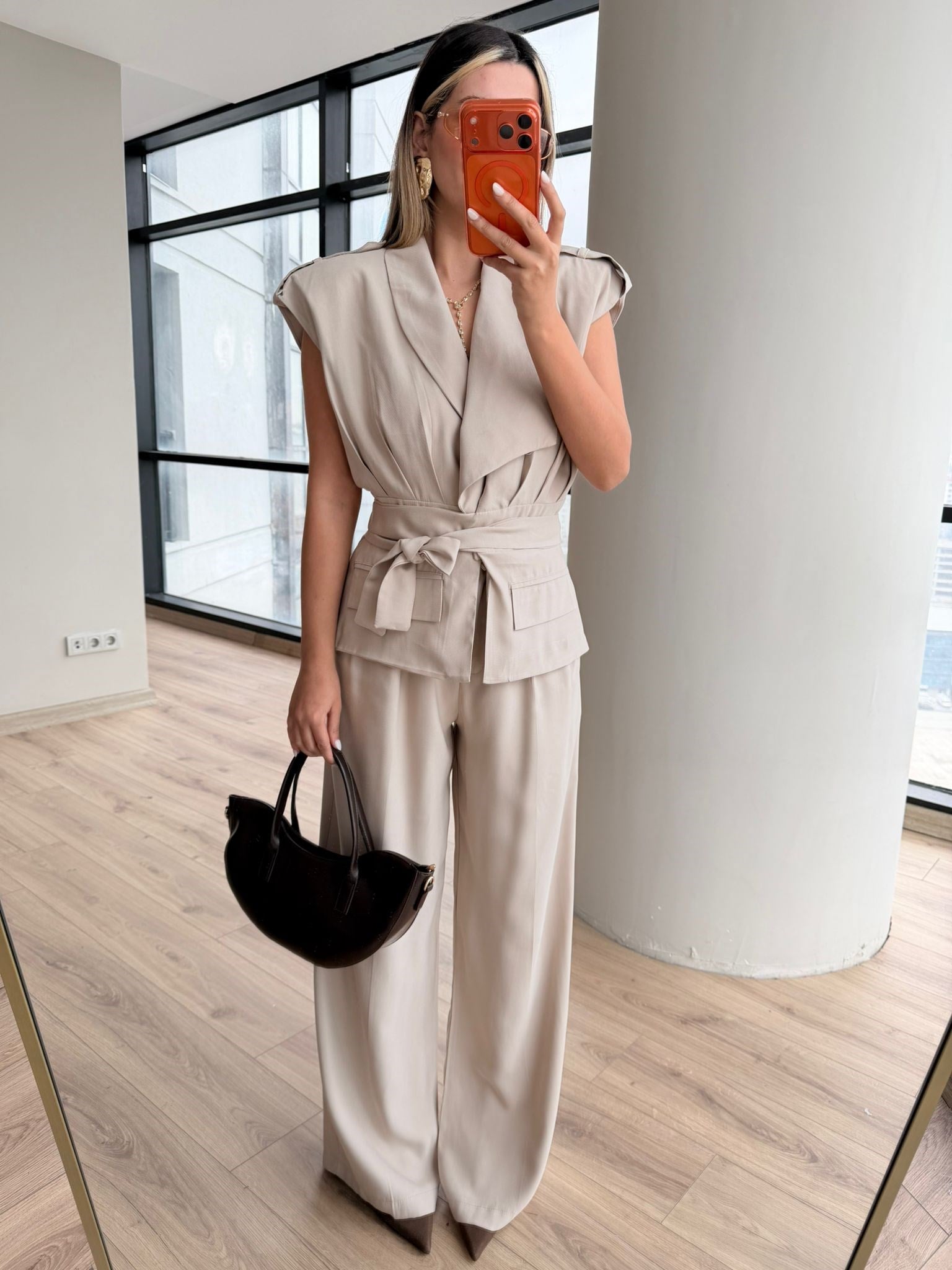 Vatkalı Yelekli Kuşaklı Takım Bej