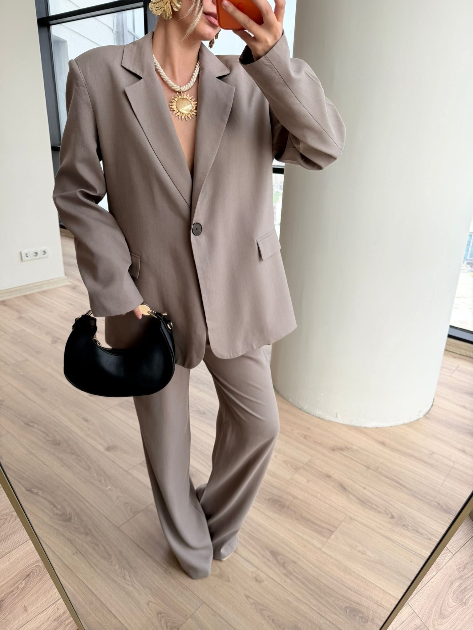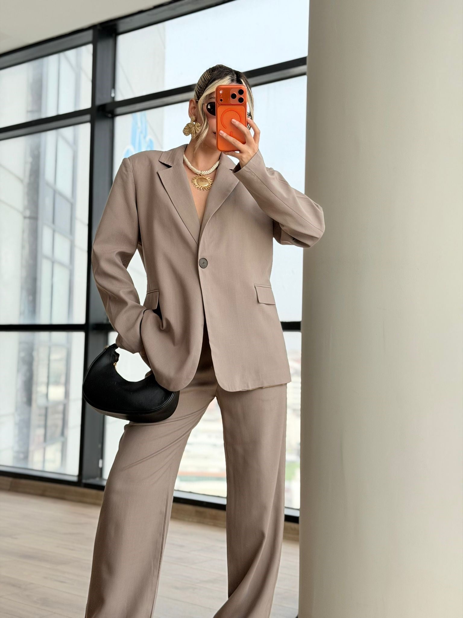 Kumaş: Tok dokuma kumaş Kalıp: Oversize / Rahat kalıp Ceket: Tek düğmeli blazer Pantolon: Düz kesim Mevsim: İlkbahar / Sonbahar / Kış