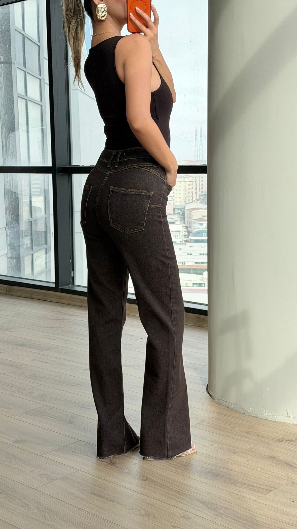 Yüksek Bel Full Likralı Denim Pantolon Kahverengi