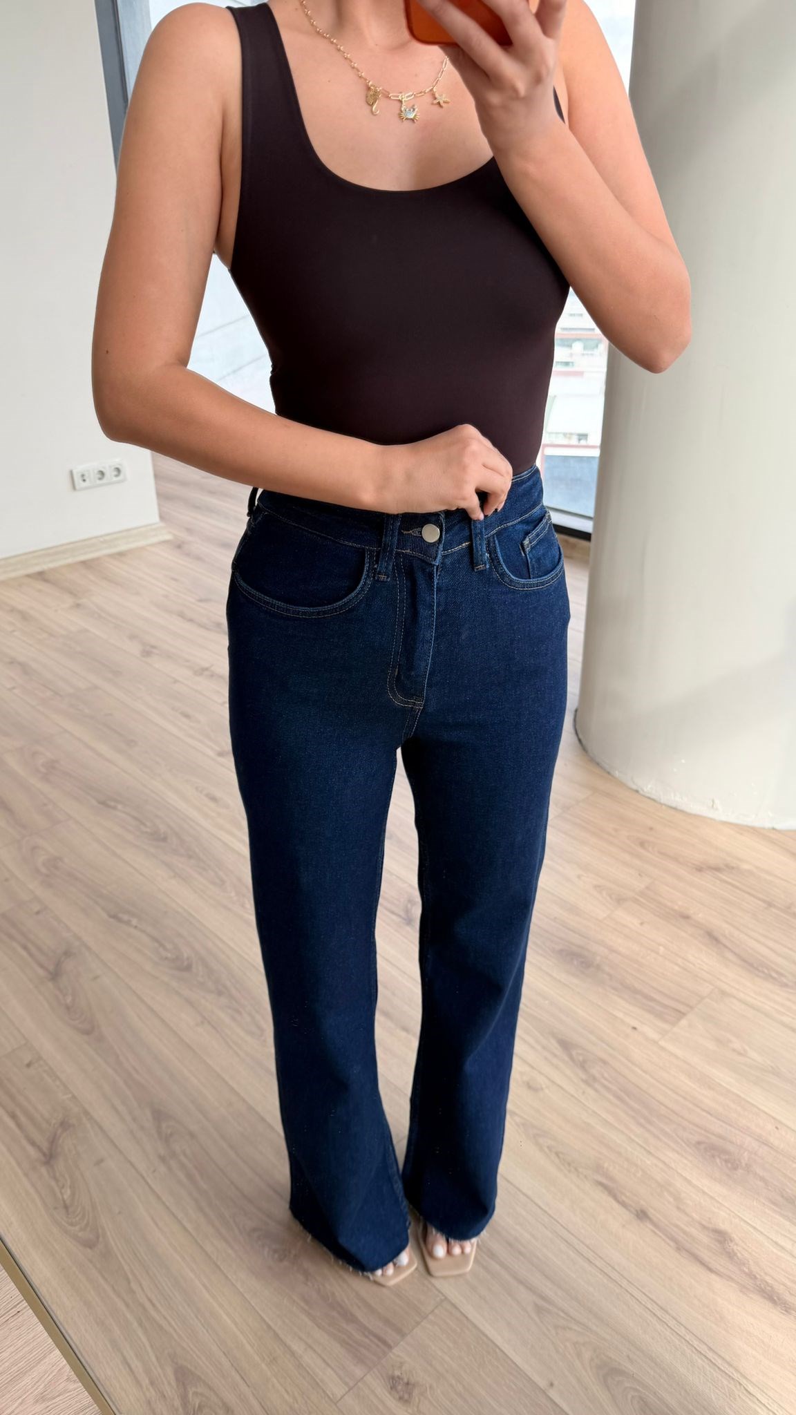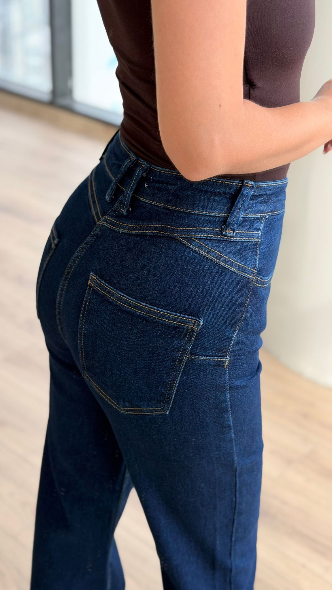 Yüksek Bel Full Likralı Denim Pantolon Mavi Kalın Askı Cupra Kahverengi Atlet