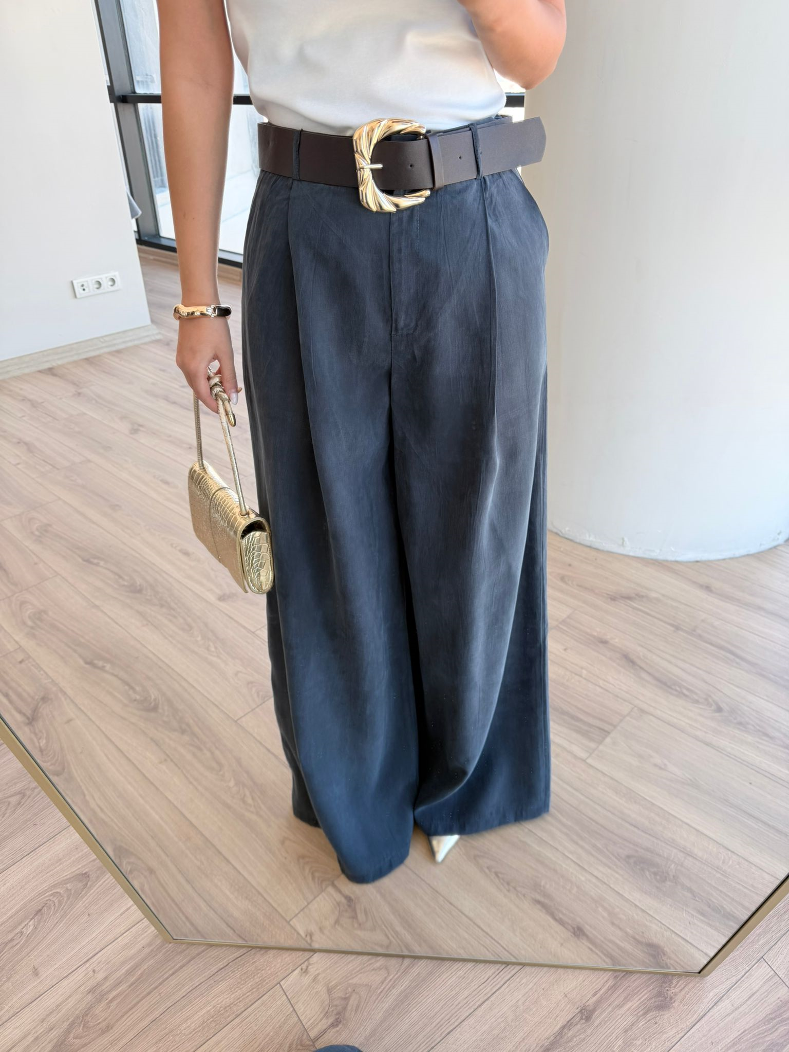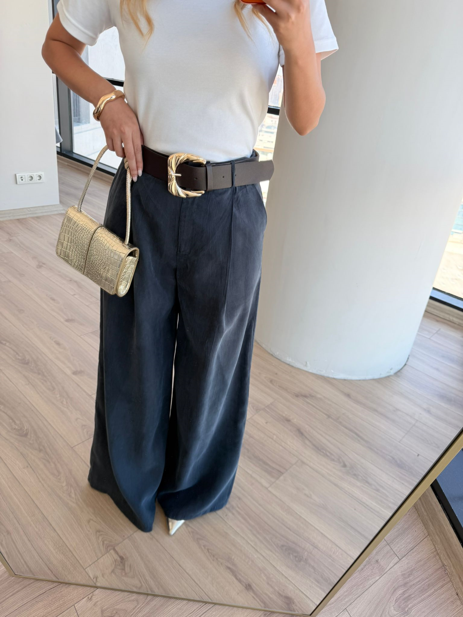 Dökümlü duruşu ve yüksek bel kesimiyle öne çıkan haki kumaş pantolon, modern ve rahat kombinlerin tamamlayıcısı.