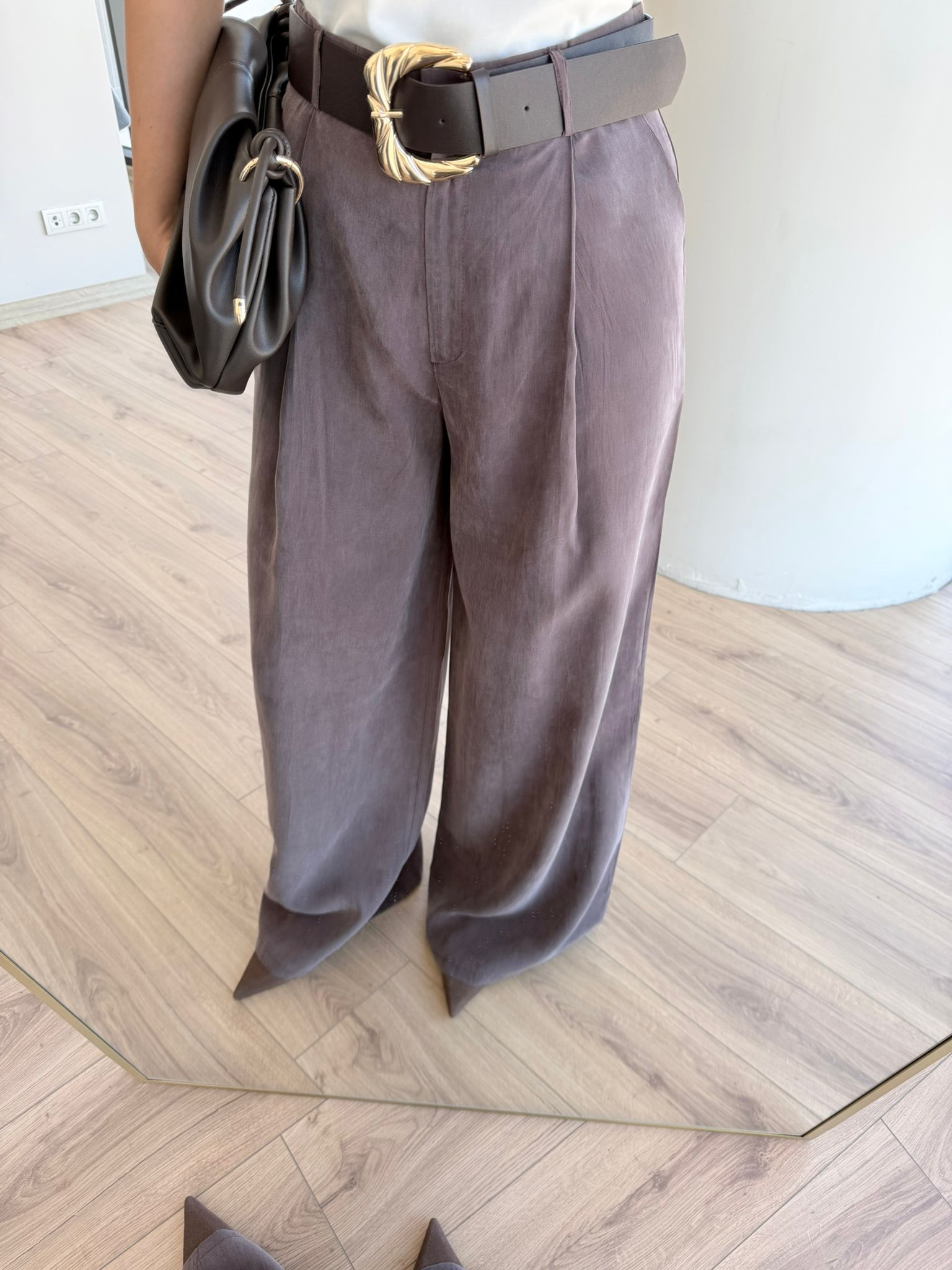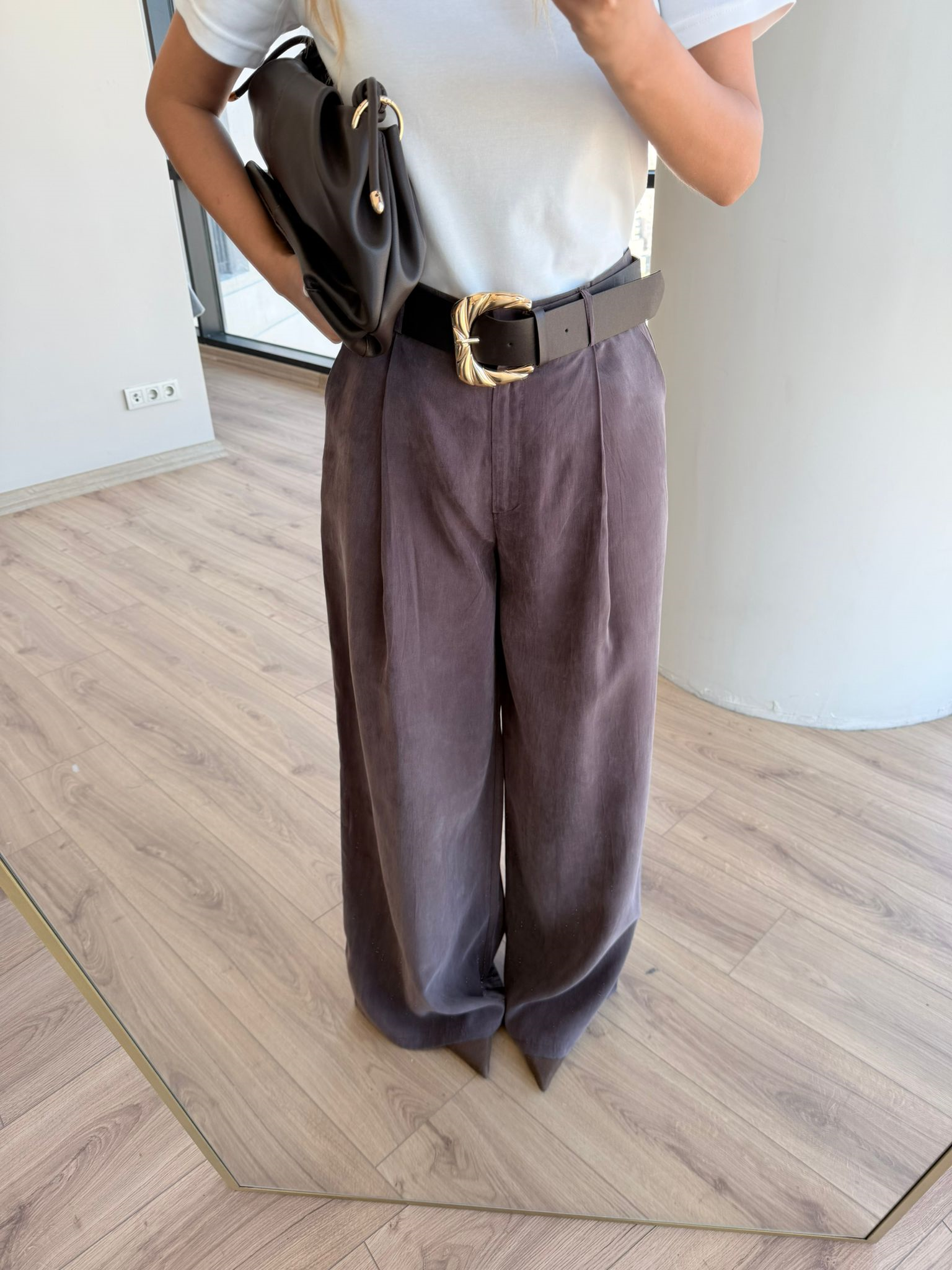 Dökümlü duruşu ve yüksek bel kesimiyle öne çıkan haki kumaş pantolon, modern ve rahat kombinlerin tamamlayıcısı.